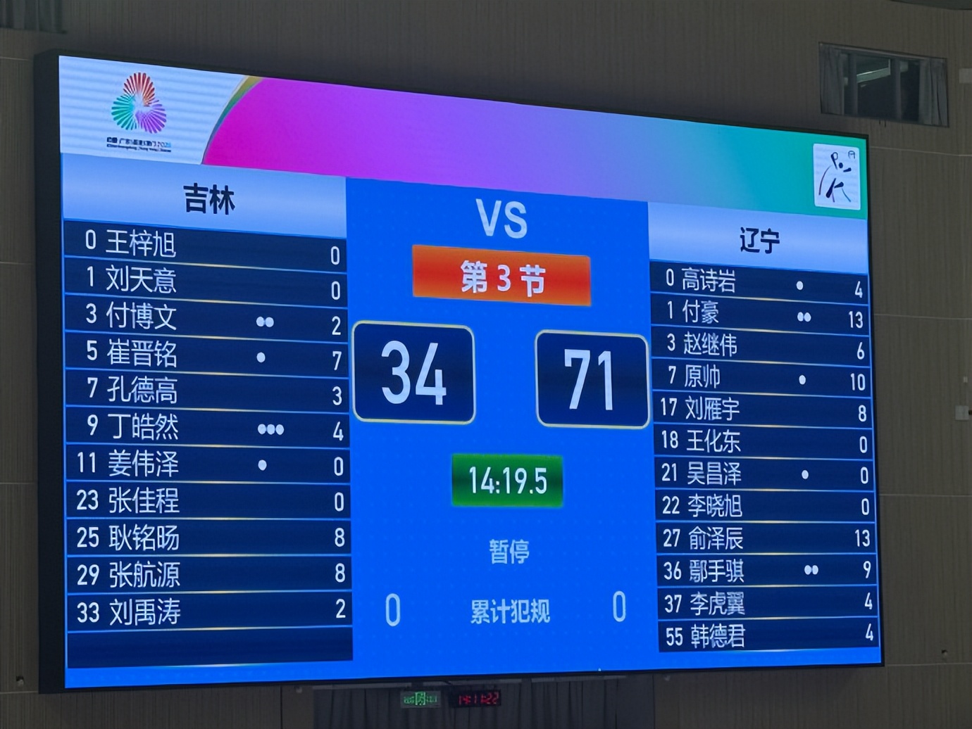北京时间11月4日,第15届全运会男篮小组赛,辽宁男篮对阵吉林男篮。比赛在上半场就失去悬念,辽宁118-68大胜吉林。付豪20分5篮板3助攻,赵继伟15分4篮板11助攻,原帅18分,俞泽辰19分6篮板2盖帽,刘雁宇14分6篮板,鄢手骐12分。吉林队方面,付博文13分,丁皓然10分,张航源10分3篮板,耿铭旸11分4篮板。