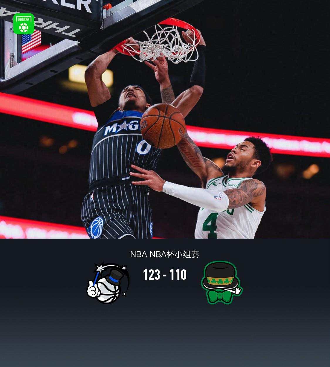 北京时间11月8日NBA NBA杯小组赛,奥兰多魔术对阵波士顿凯尔特人。半场魔术59-51凯尔特人,最终魔术123-110凯尔特人。