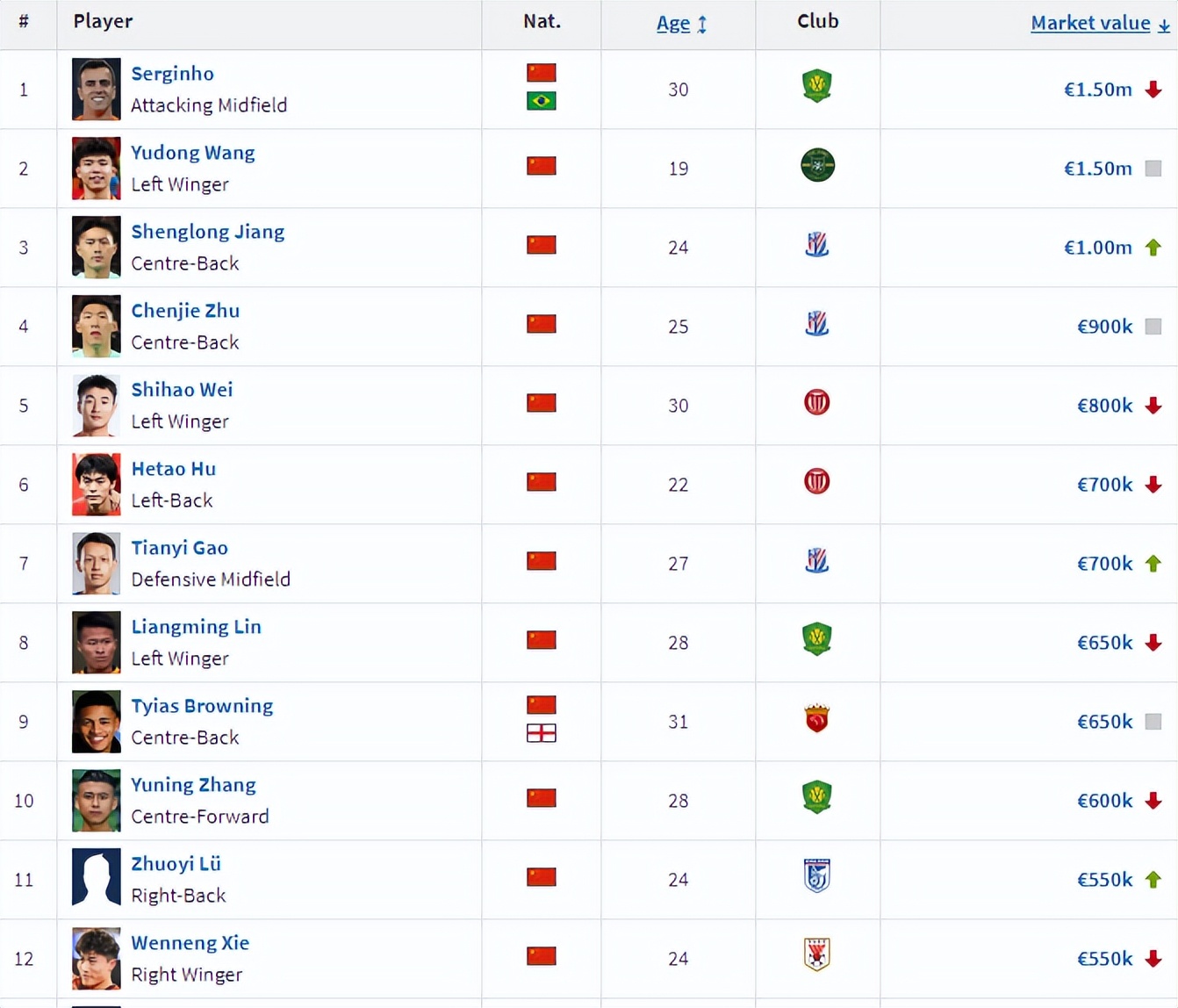 在本土球员里,塞尔吉尼奥、王钰栋以150万欧元排名榜首,其次是蒋圣龙(100万)、朱辰杰(90万),其中蒋圣龙身价上涨15万。几乎因伤缺席一年之后,武磊身价从120万下降到50万。