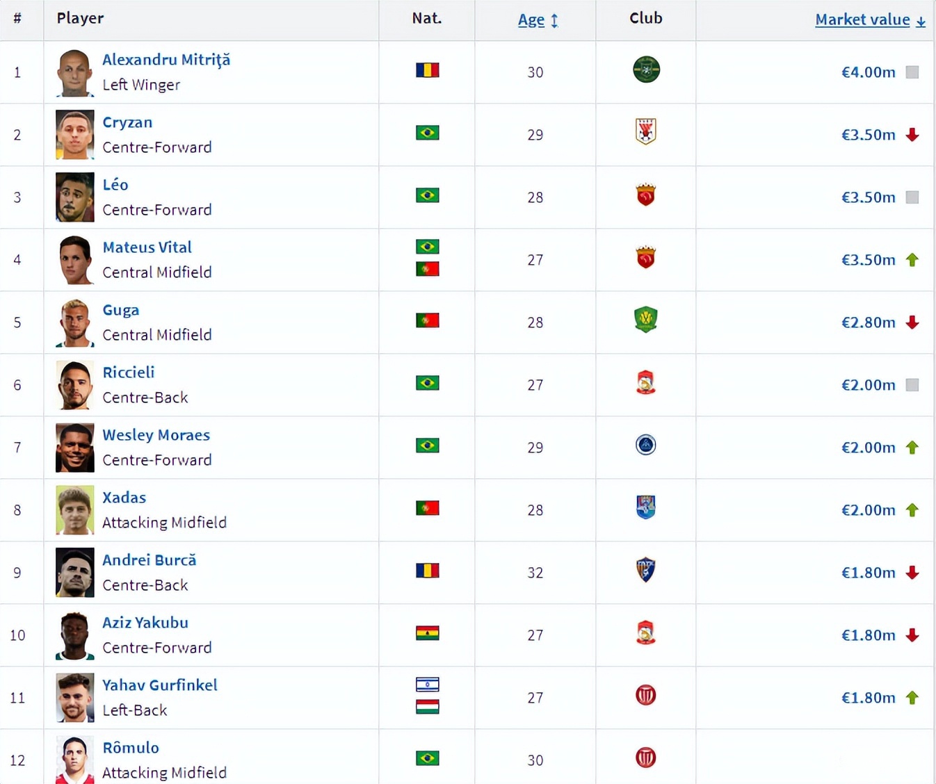 在中超球员身价排行榜上,克雷桑、莱昂纳多、维塔尔以350万欧元并列第二位,古加以280万欧元排名第4位,里切利、韦斯利、哈达斯以200万并列第6位,布尔克、阿齐兹、古尔芬克尔、罗慕洛的身价为180万欧元。其中,韦斯利、哈达斯身价分别上涨20万、50万欧元,布尔克、阿齐兹的身价分别下降70万、20万。